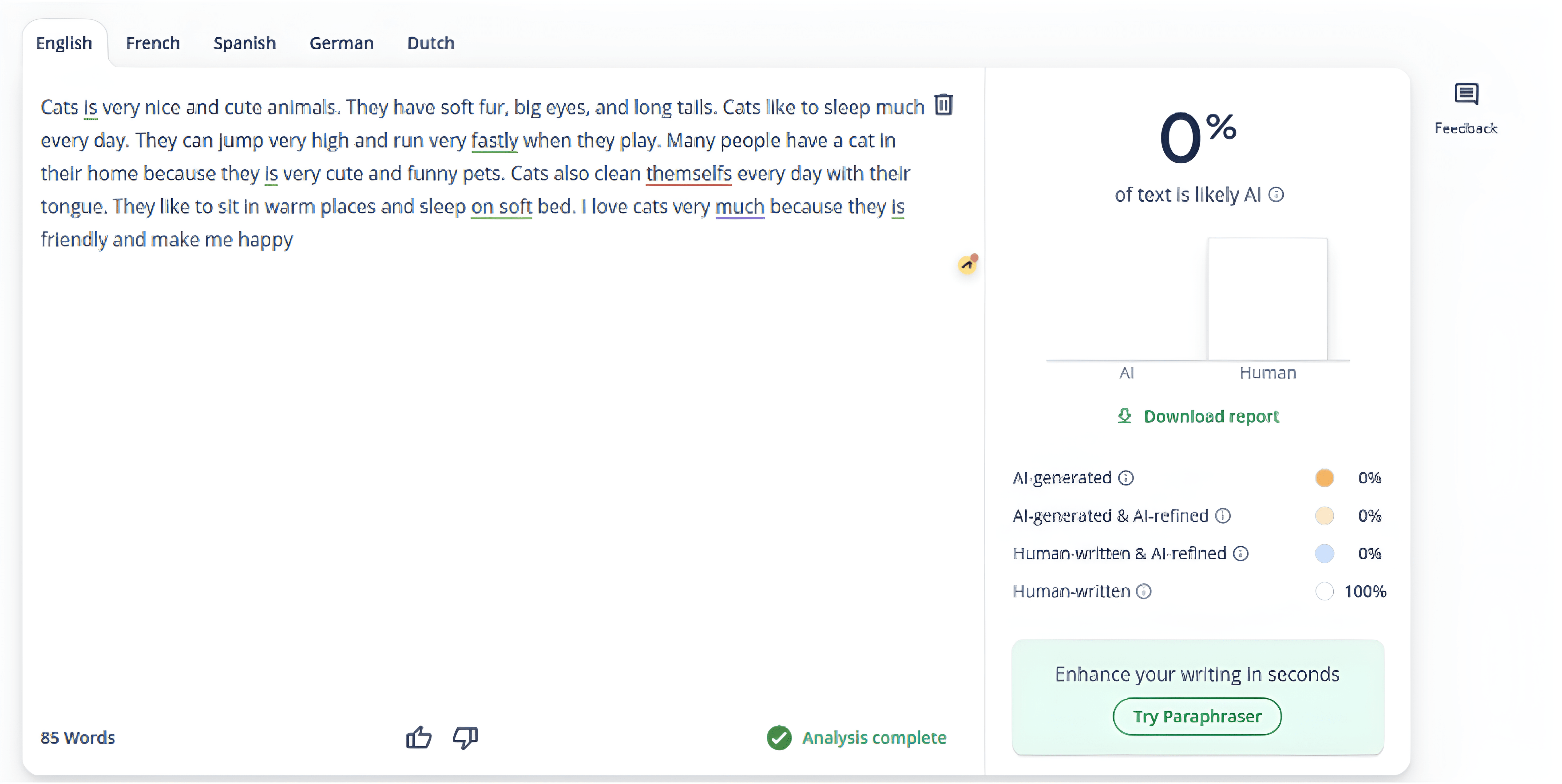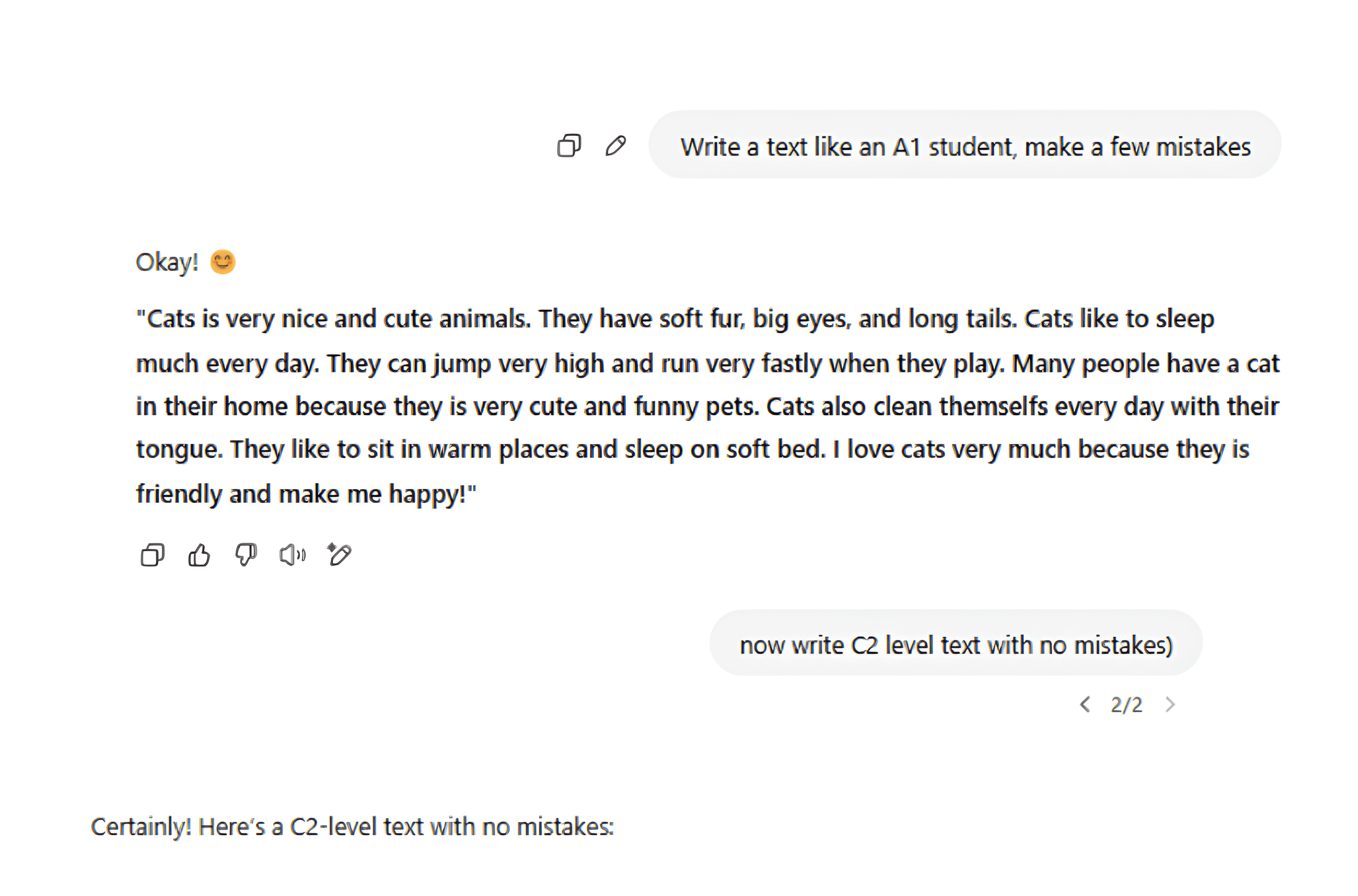 Не довіряйте текстам без помилок або з лексикою рівня С1. Практично неможливо, щоб навіть найсильний учень написав текст без жодної помилки. Десь може бути одрук або кома в неправильному місці тощо. Ви знаєте ваших учнів, і якщо учень рівня A1-A2 здає бездоганний текст зі складною лексикою, це точно червоний прапорець.
